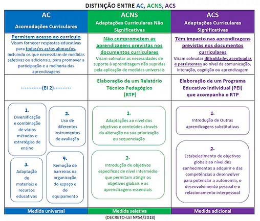 No quadro do Decreto-Lei n.º 54/2018 e do respetivo Manual de Apoio à Prática, a distinção entre Acomodações Curriculares (AC), Adaptações Curriculares Não Significativas (ACNS) e Adaptações Curriculares Significativas (ACS) assenta no grau de impacto que cada medida tem no currículo, nas aprendizagens previstas e nos instrumentos pedagógicos e educativos associados ao percurso do aluno.